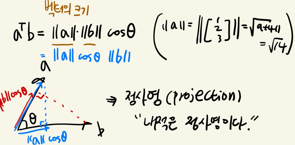 이런 식으로 벡터 b에 정사영한 a의 크기도 구하고,