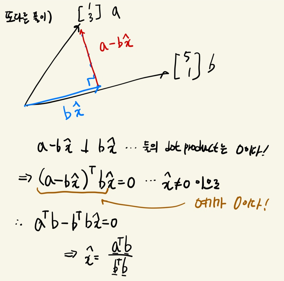 임의의 계수 x를 b에 곱해서 벡터 b에 내린 a의 정사영이라 하고,
