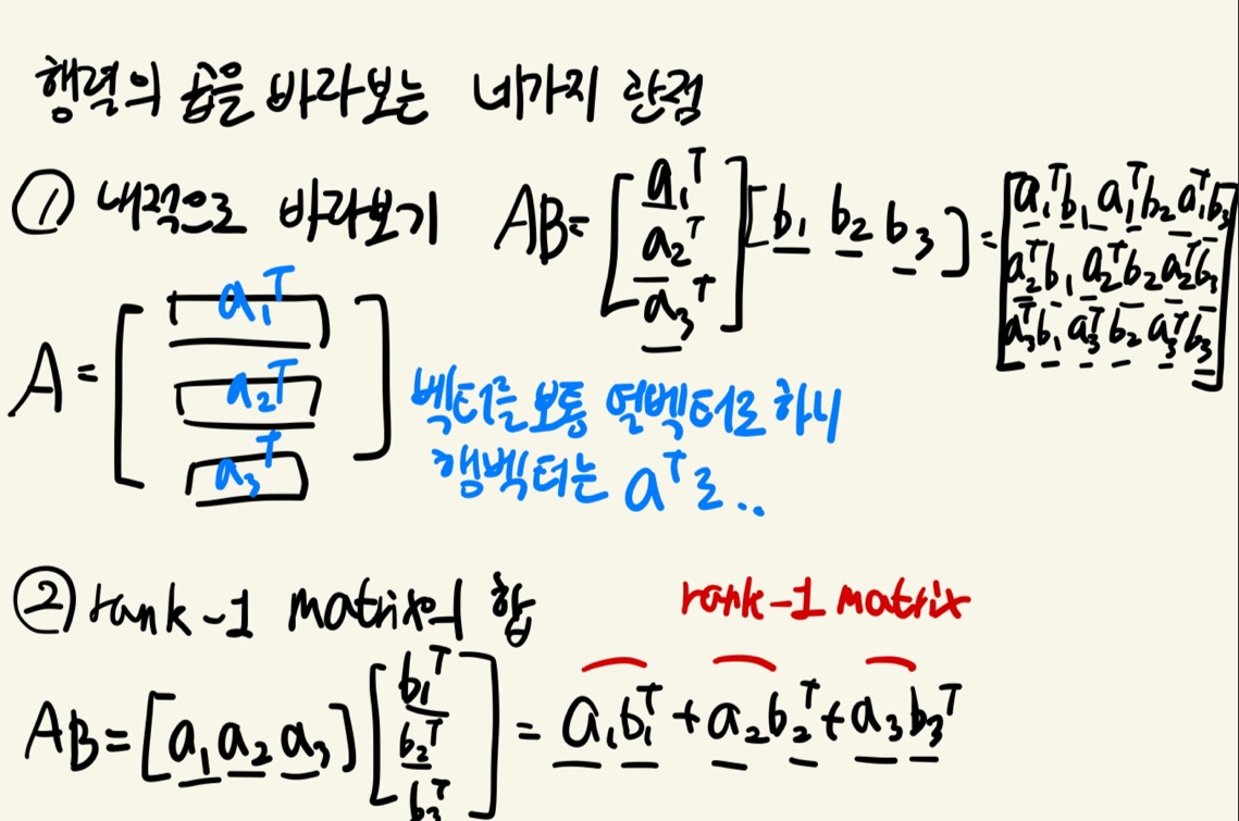 추가로, 행렬의 곱을 바라보는 네가지 관점을 언급.