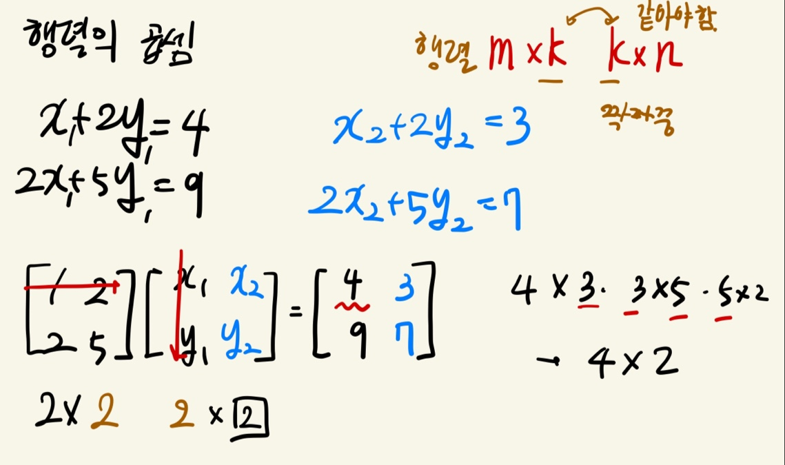 행렬은 곱할 때 앞에 있는 것과 뒤에 있는 것의 짝짜꿍이 맞아야 한다.앞 행렬의 행과 뒷 행렬의 열이 만나므로