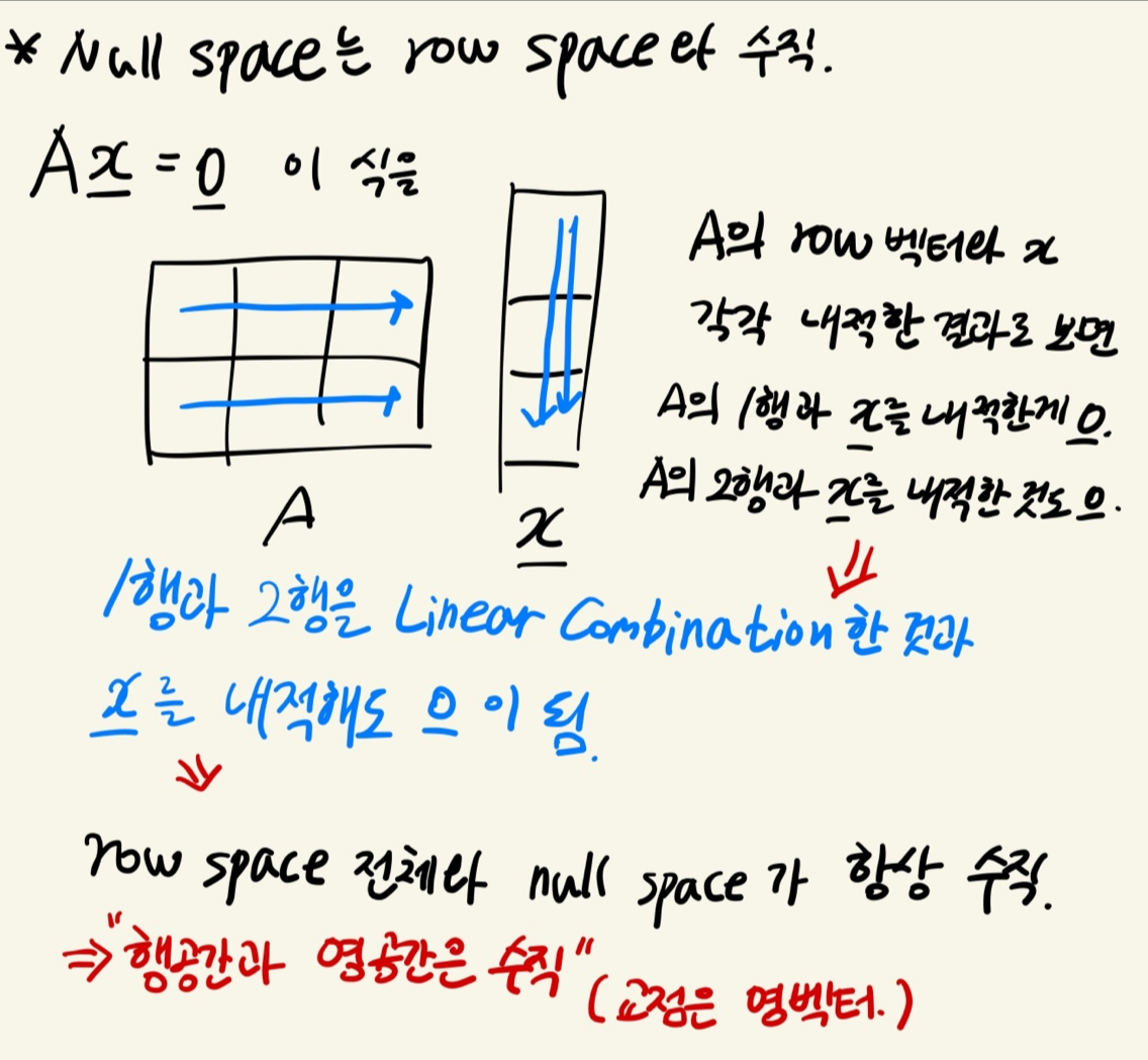 결국, row space 전체와 Null Space는 항상 수직하다.