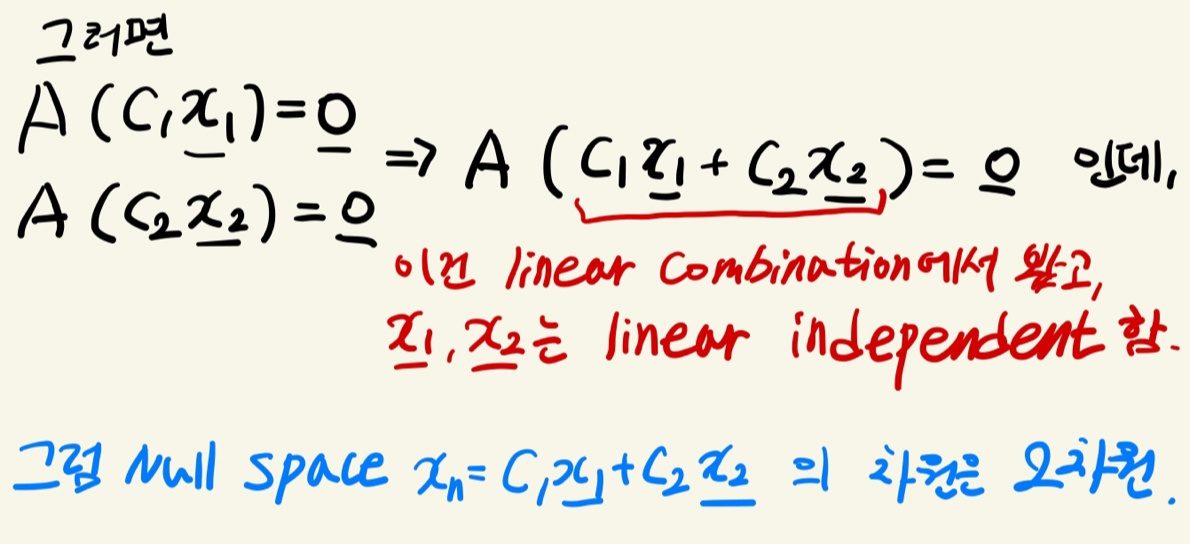 그럼, 1행과 2행을 Linear Combination한 것과 x를 내적해도 0벡터.