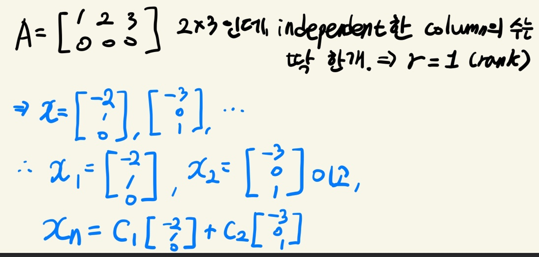 이 경우, Ax=0을 만족하는 x는 2가지 vector 가 나올 수 있고,
