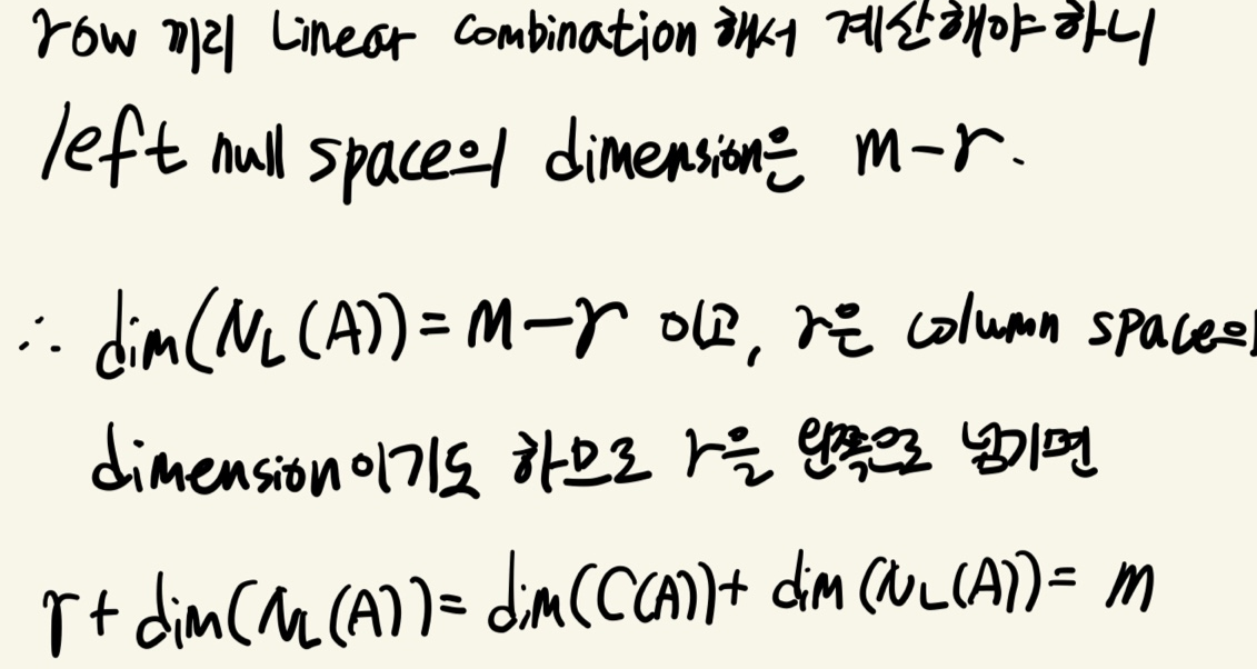 m x n 행렬 A에 대해 $$dim(N_{L}(A))=m-r$$ (r = rank(A), N_{L}(A) = Left null space)