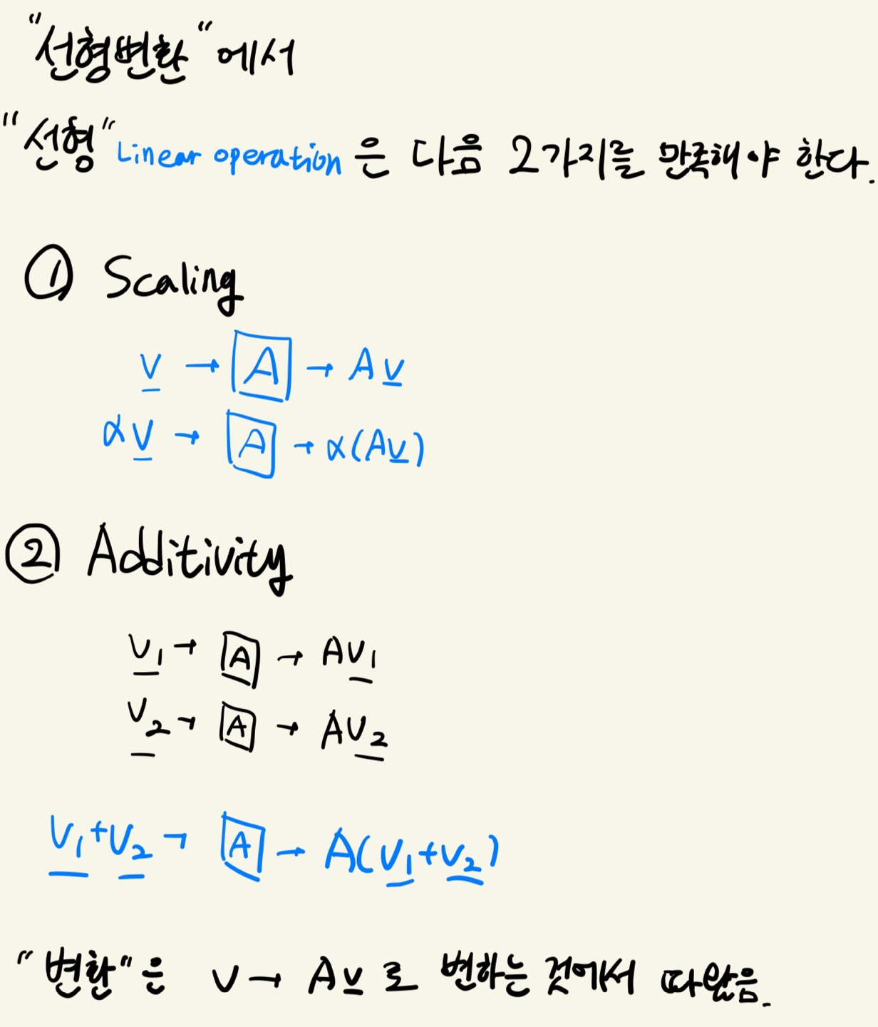 선형변환 과정의 선형 이라함은 Scaling과 Additivity가 성립해야 한다.