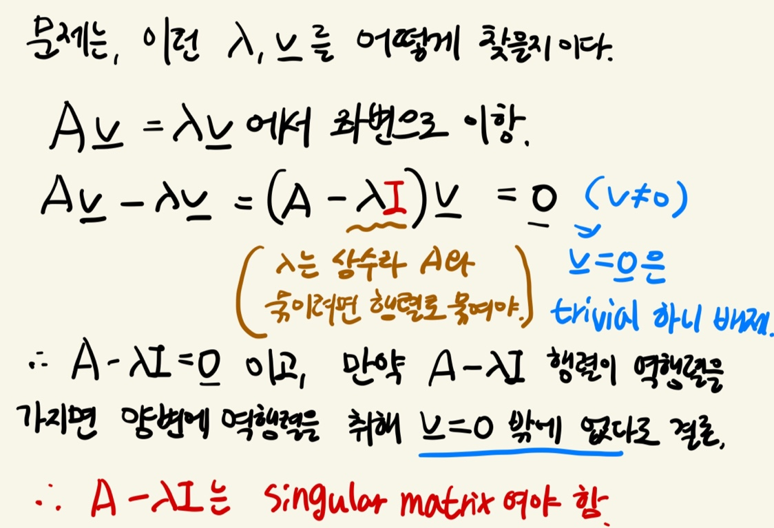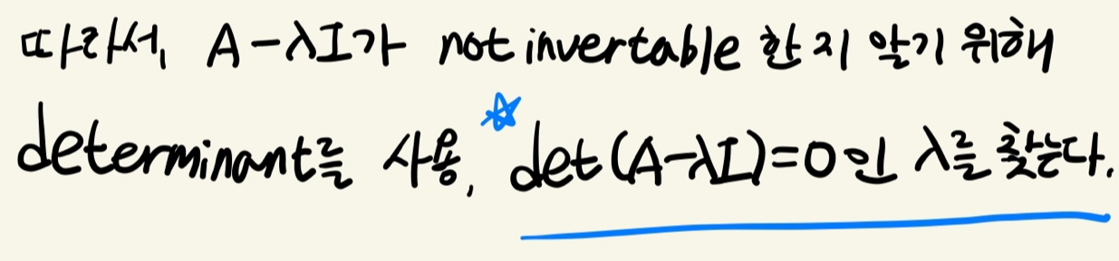 A-λI는 역행렬을 가지지 않는 singular matrix이다. (not invertable)
