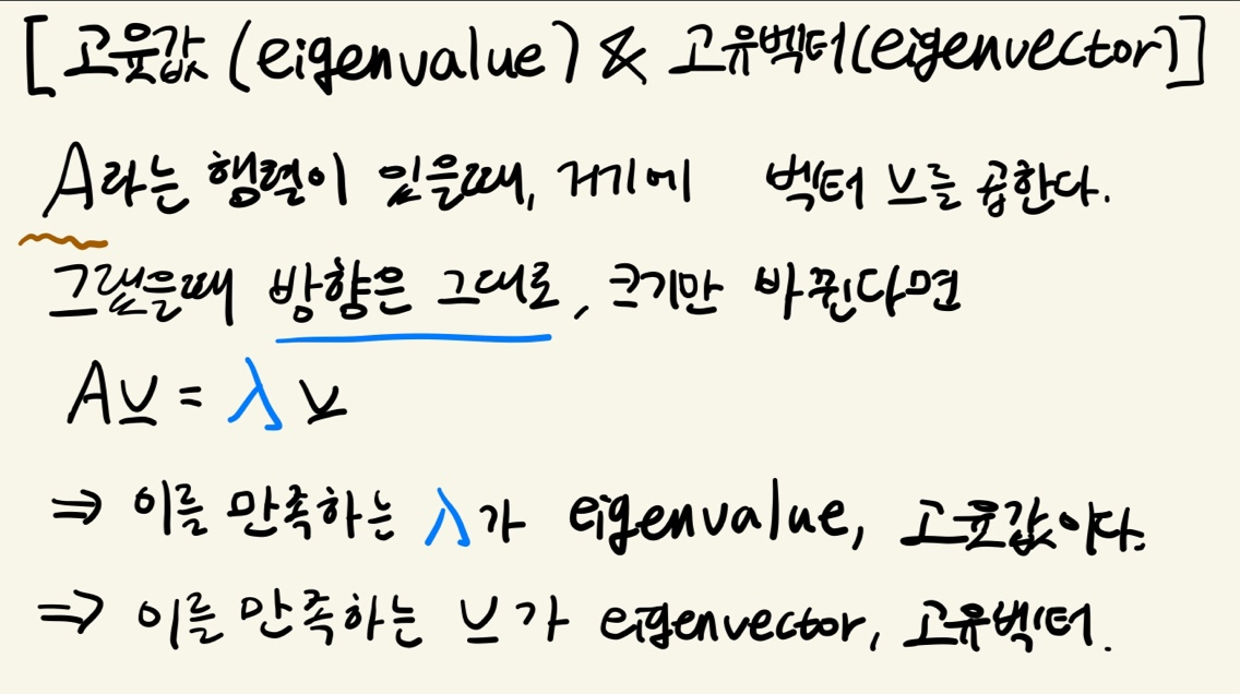 고윳값(eigen value)은 람다( λ )로 표기하며 행렬 A에 벡터 v를 곱해서