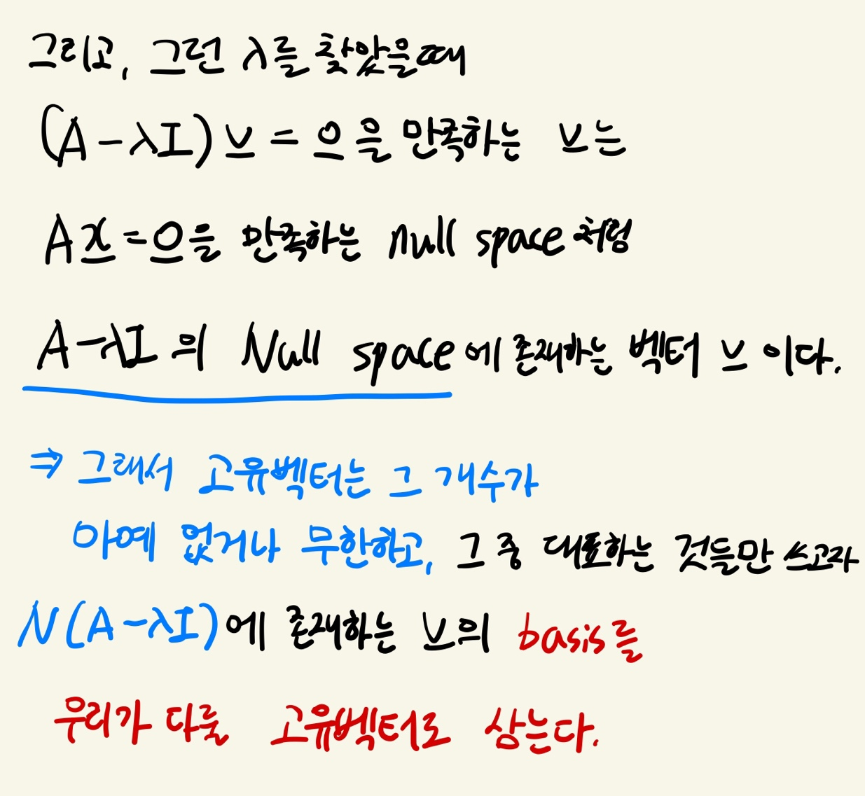 → N(A-λI)에 존재하는 v의 basis를 우리가 다룰 고유벡터로 삼는다.