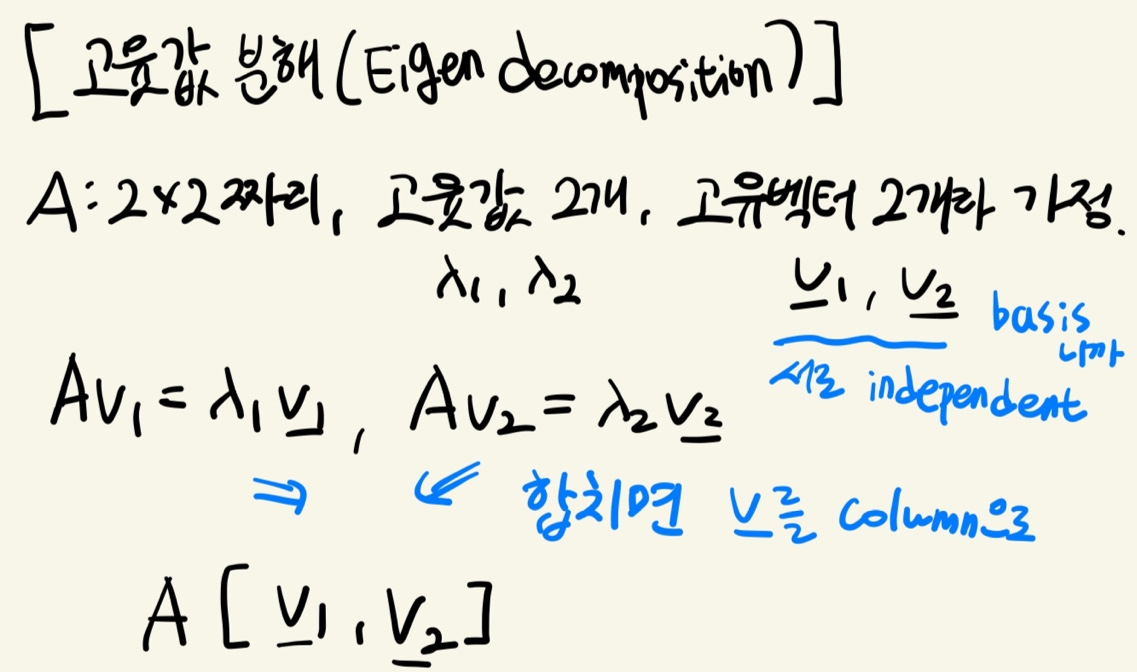 2x2 짜리 행렬 A에 대해 고윳값과 고유벡터가 2개라 가정하자.