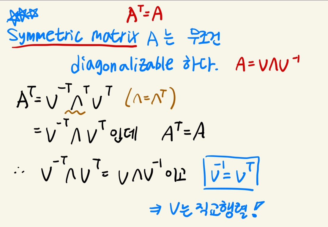 행렬 A가 Symmetric하면 무조건 diagonalizable 하고, V는 직교행렬이다.