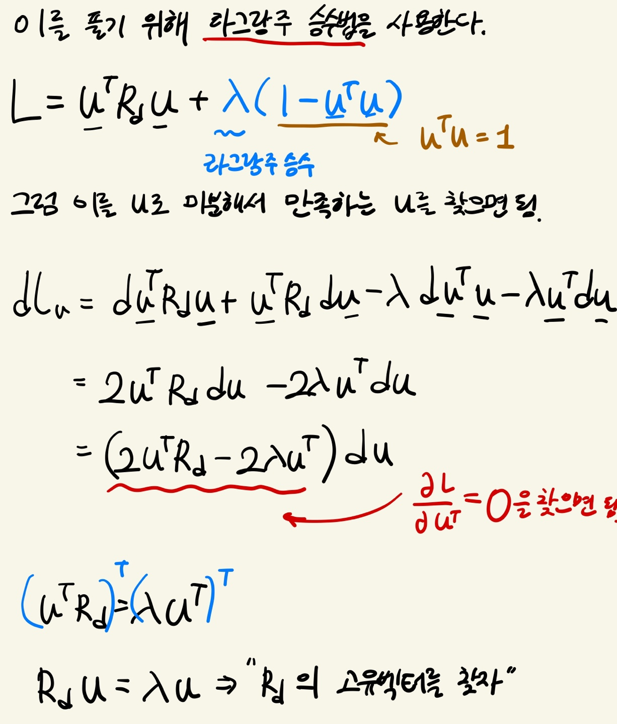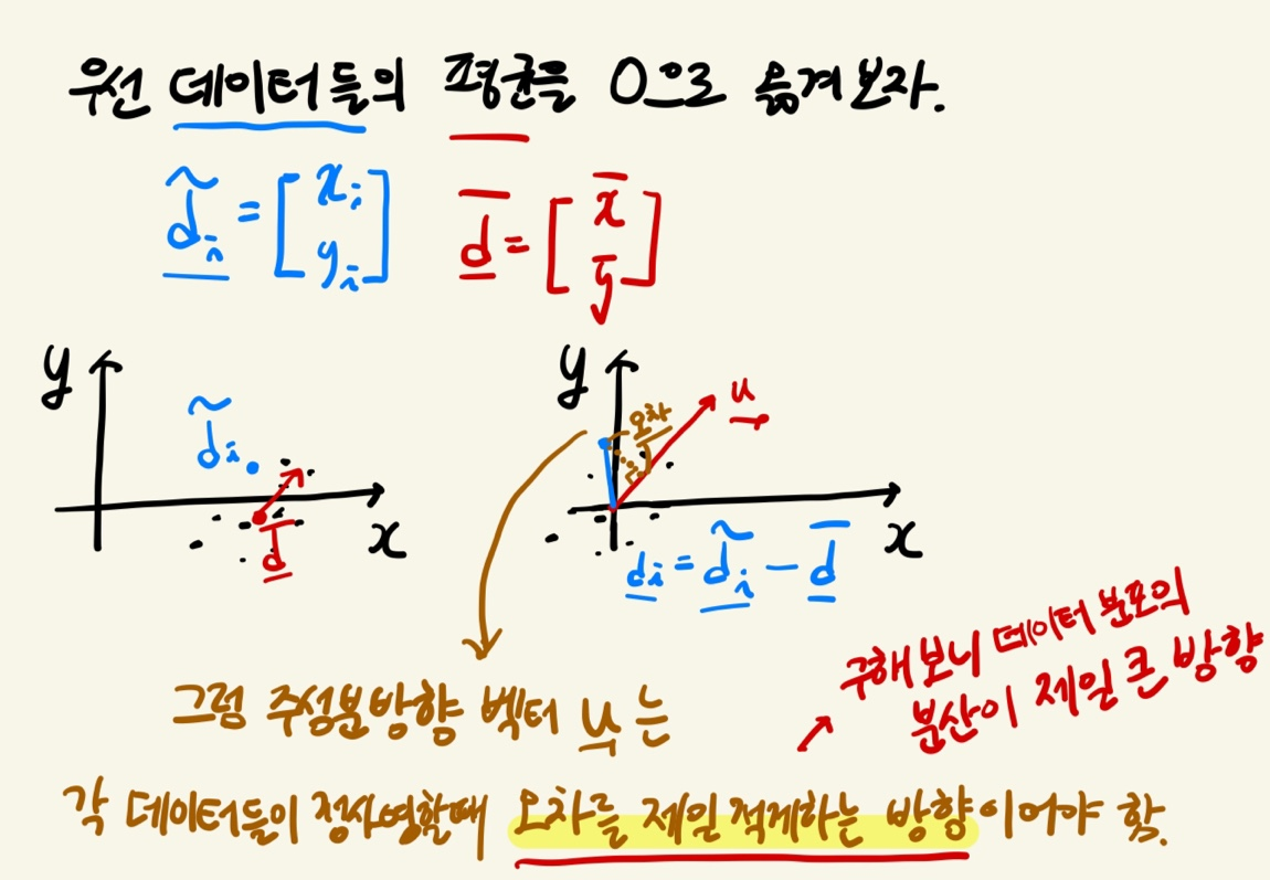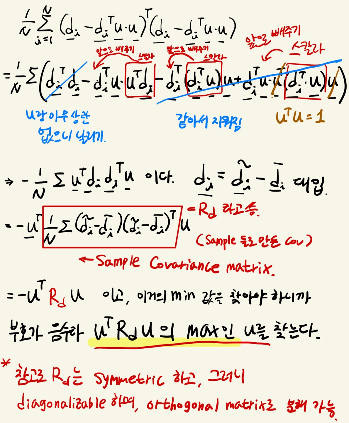 PCA에서 찾고자 하는 주성분 방향을 벡터 u로 잡고,