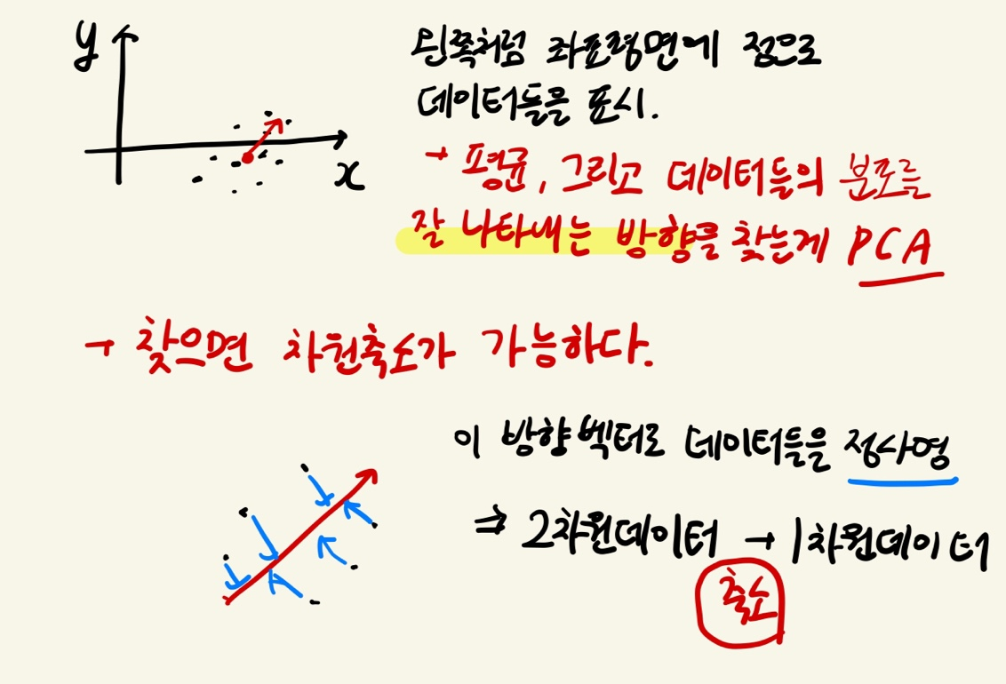 이 방향을 찾으면, 그 방향으로 뻗는 수직선에 대해2차원 점들을 정사영해 1차원으로 데이터를 축소할 수 있다. (차원 축소)